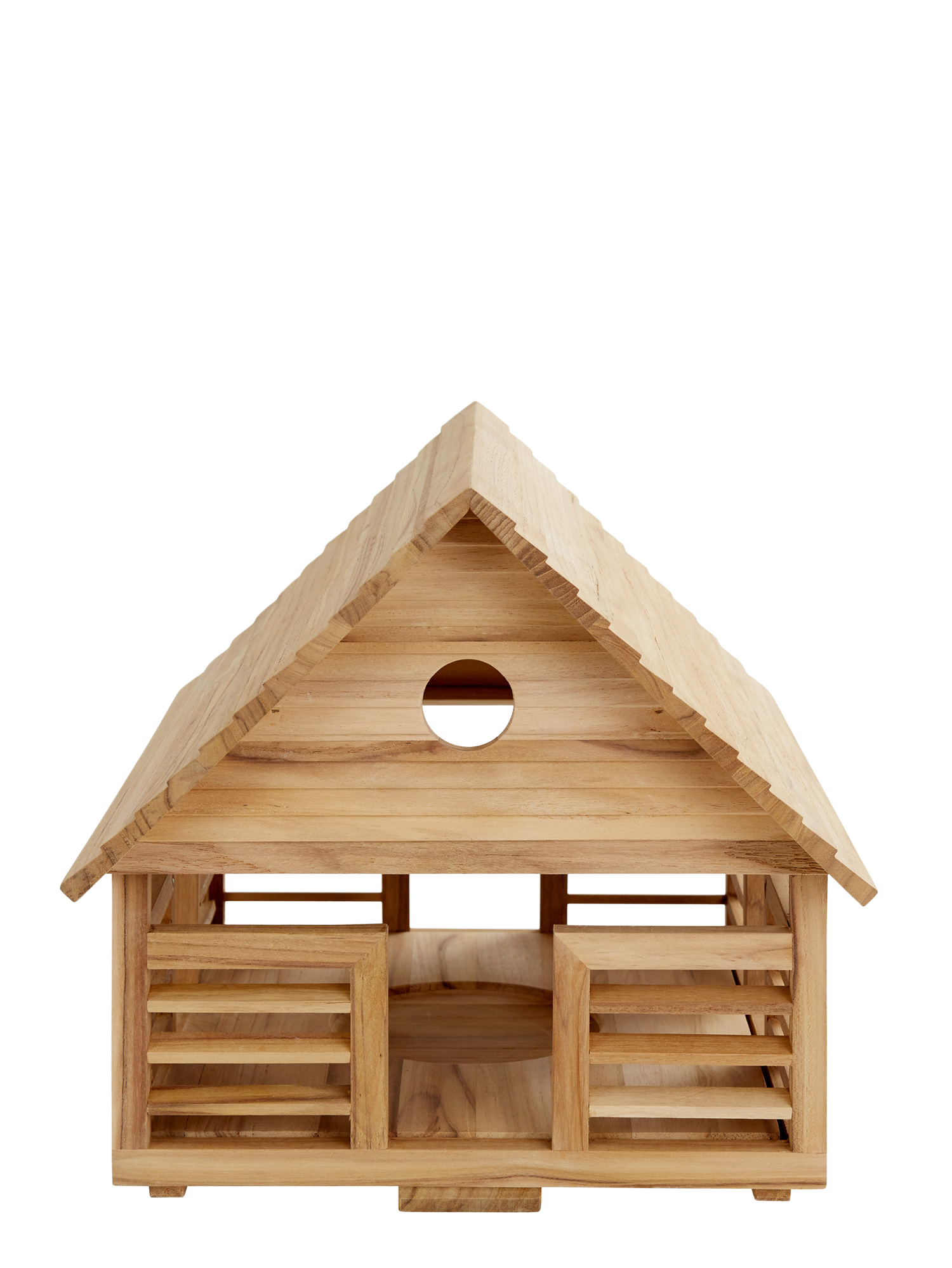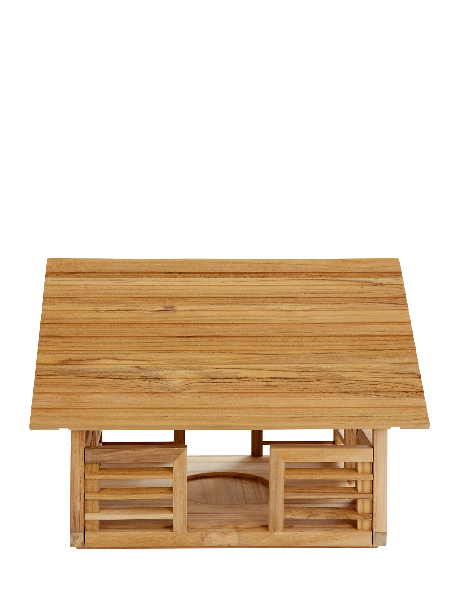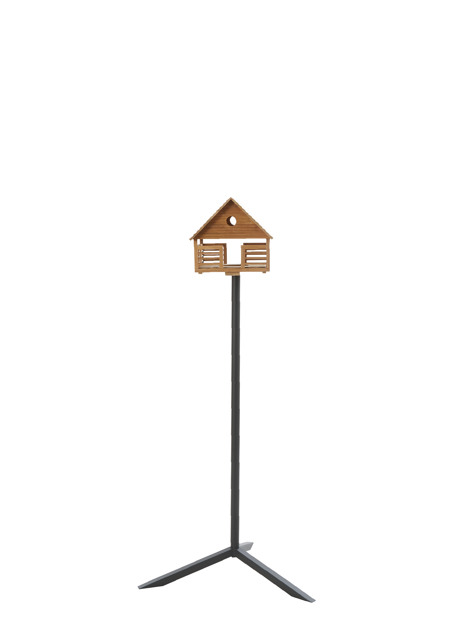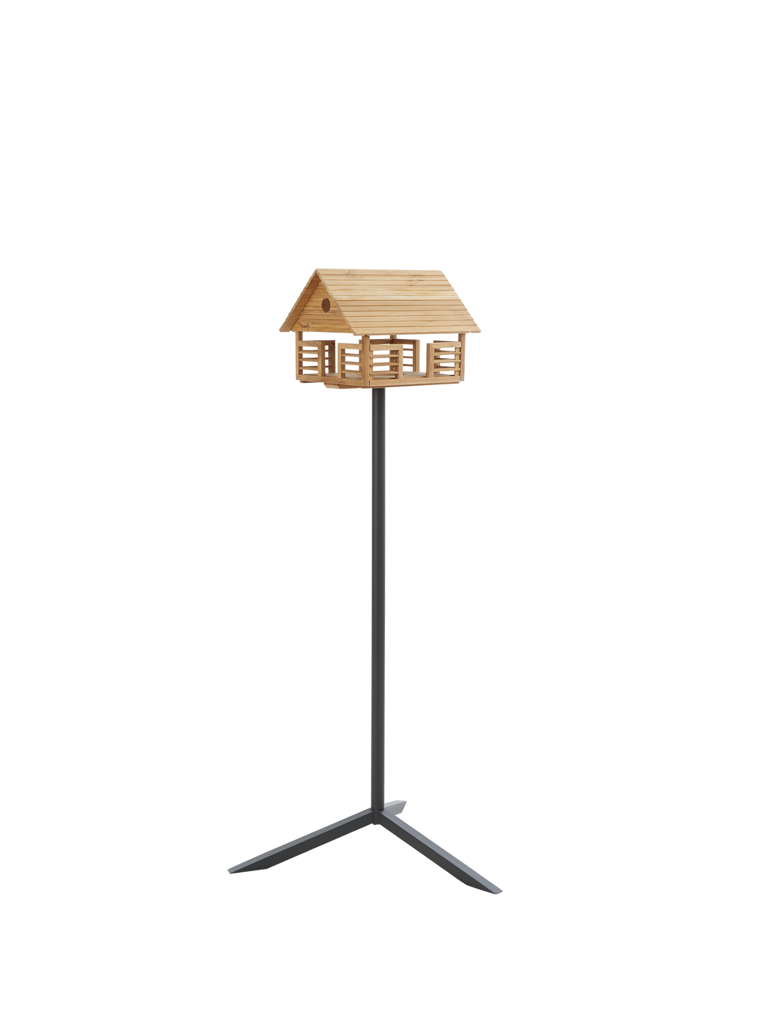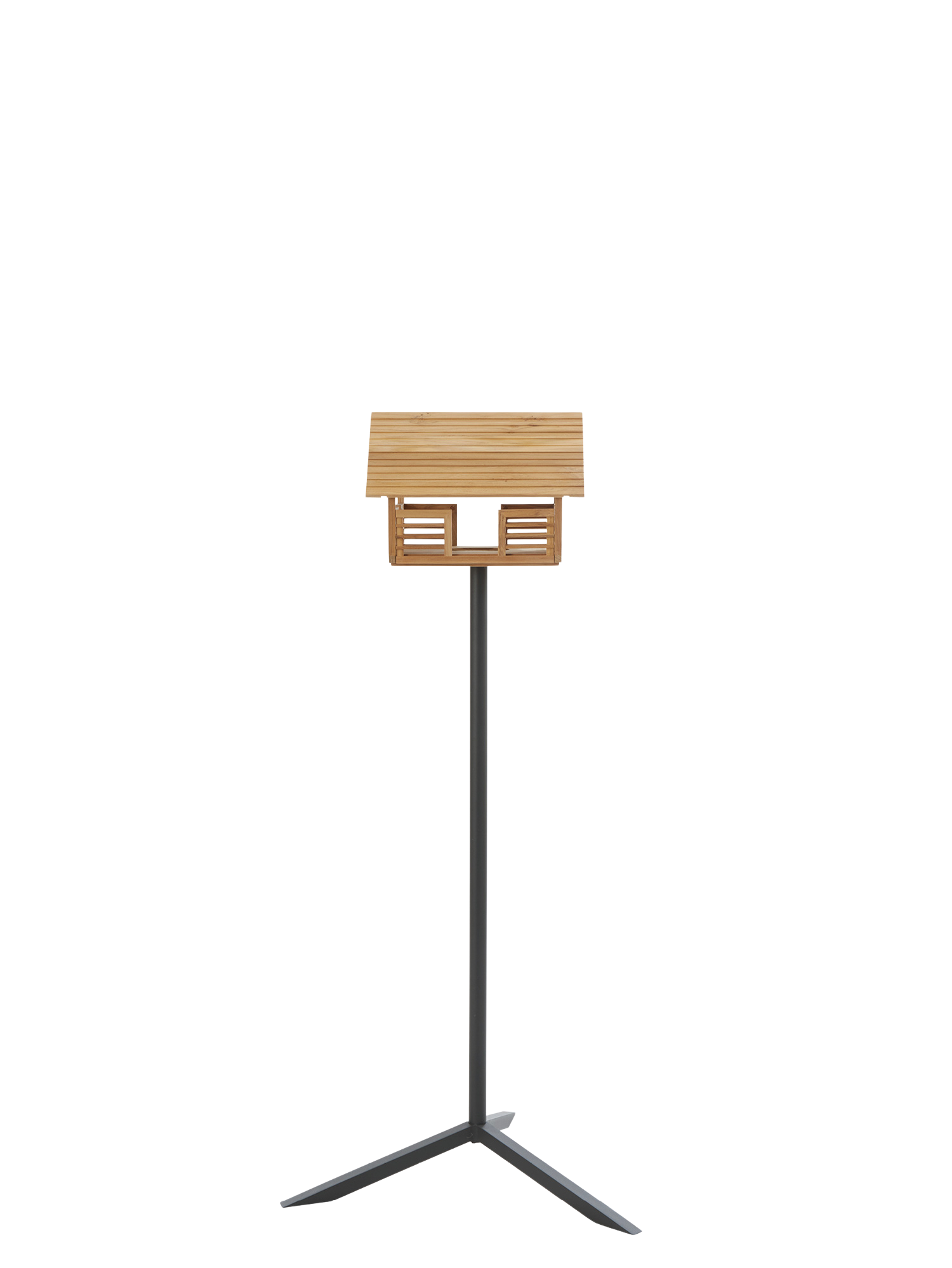 Die offene Bauweise des filigranen Futterplatzes erlaubt kleinen Vögeln wachsame Blicke nach allen Seiten und Menschen ungehinderte Sicht auf das lebhafte Geschehen. An der Längsseite lässt sich mit einem Handgriff die Futterlade herausziehen. In bester Handwerkstradition aus Teakholz gefertigt, steht das Vogelhaus bei dieser Beetlösung auf einem stabilen, unauffälligen Ständer aus pulverbeschichtetem Aluminium. Er wird mit mitgelieferten Spießen im Boden fixiert.
