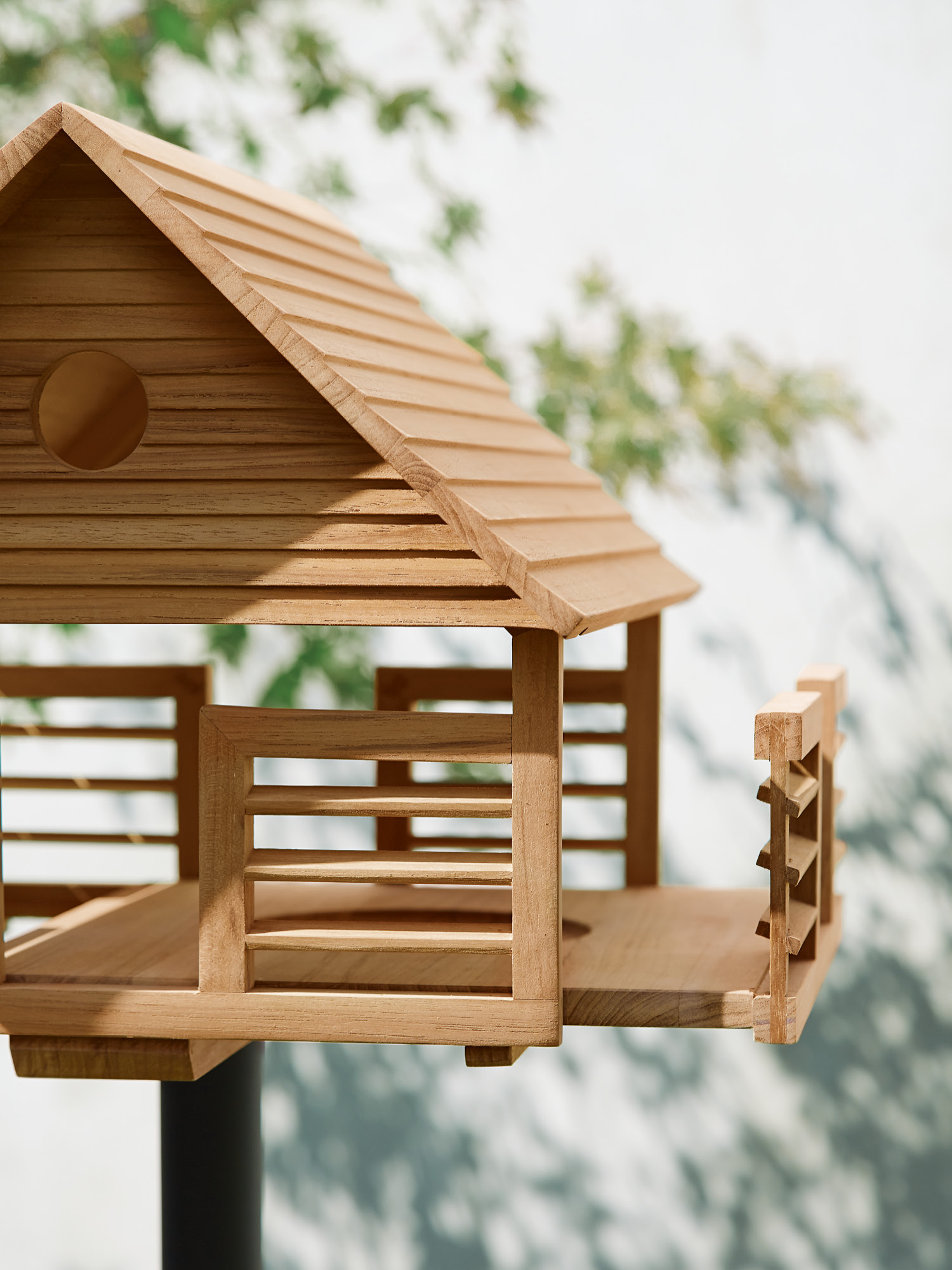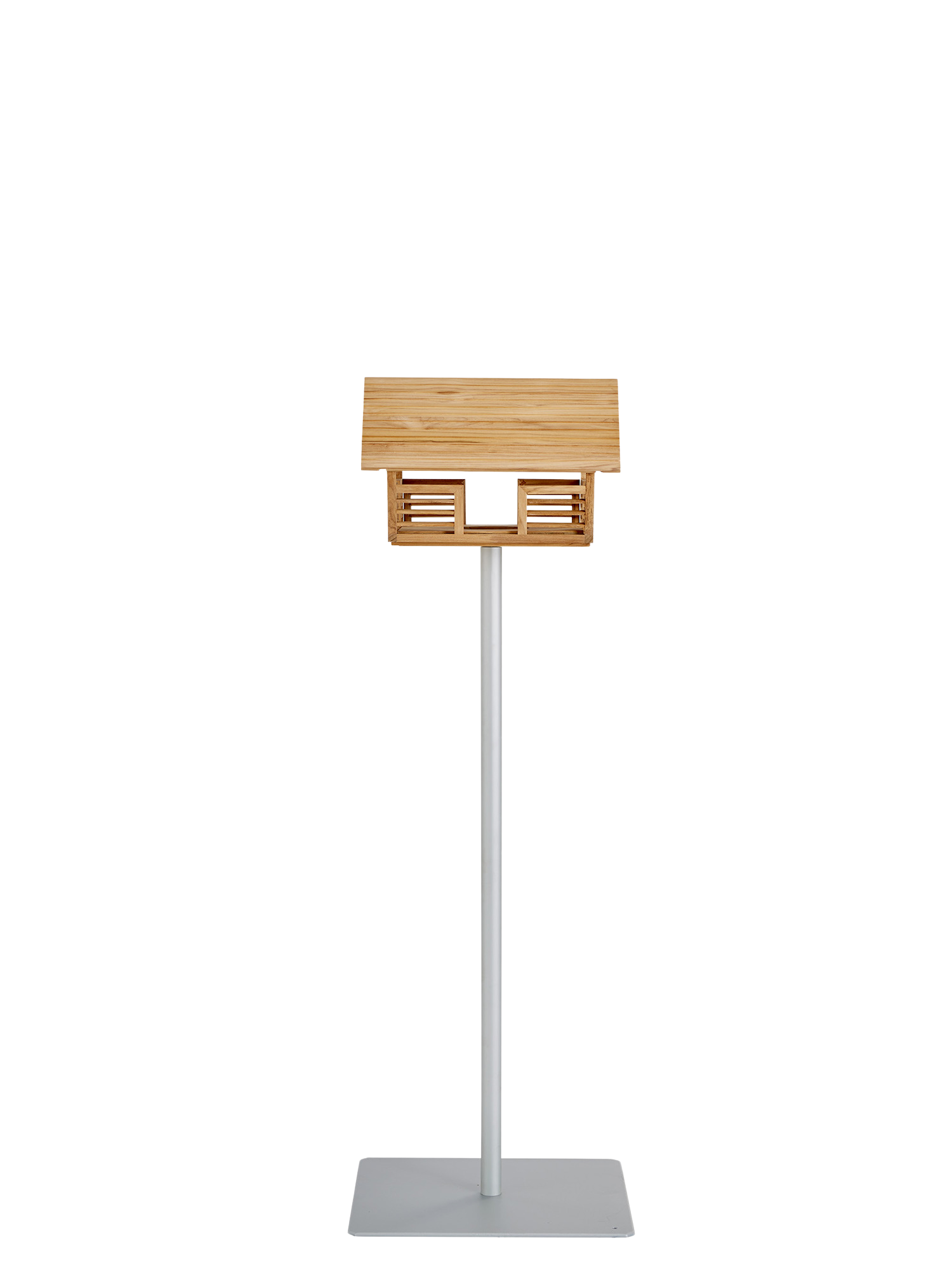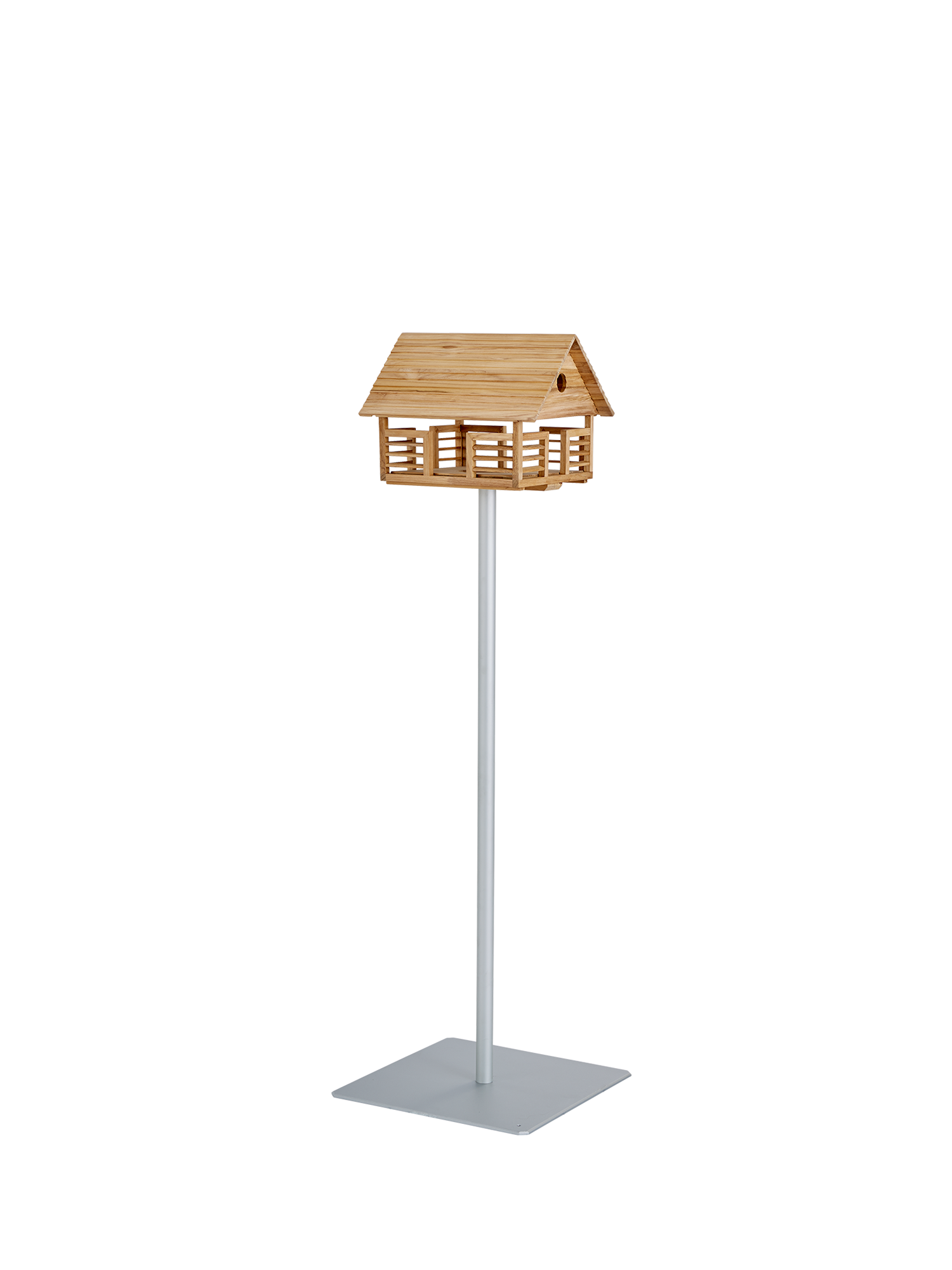 Die offene Bauweise des filigranen Futterplatzes erlaubt kleinen Vögeln wachsame Blicke nach allen Seiten und Menschen ungehinderte Sicht auf das lebhafte Geschehen. An der Längsseite lässt sich mit einem Handgriff die Futterlade herausziehen. In bester Handwerkstradition aus Teakholz gefertigt, steht das Vogelhaus bei dieser Terrassenlösung auf einem stabilen Ständer aus lackiertem Stahl mit quadratischem Fuß, der auf der Terrasse für Standfestigkeit sorgt.