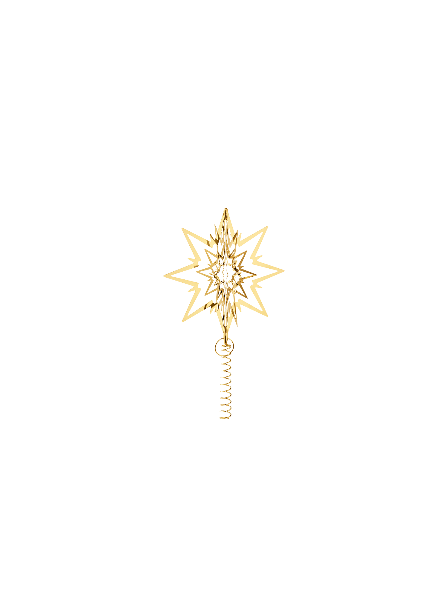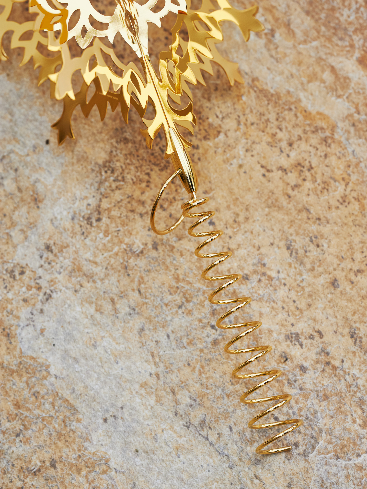 Am Seidenbändchen aufgehängt, ziert die dreidimensionale Eisblume – mit kunstvollen Arabesken aus Edelstahl gestanzt und mit 18-karätigem Gold plattiert – Fenster oder Tannenzweige. Mit der mitgelieferten Spiralhalterung entfaltet sie auch an der Spitze des Weihnachtsbaums ihre magische Kraft.