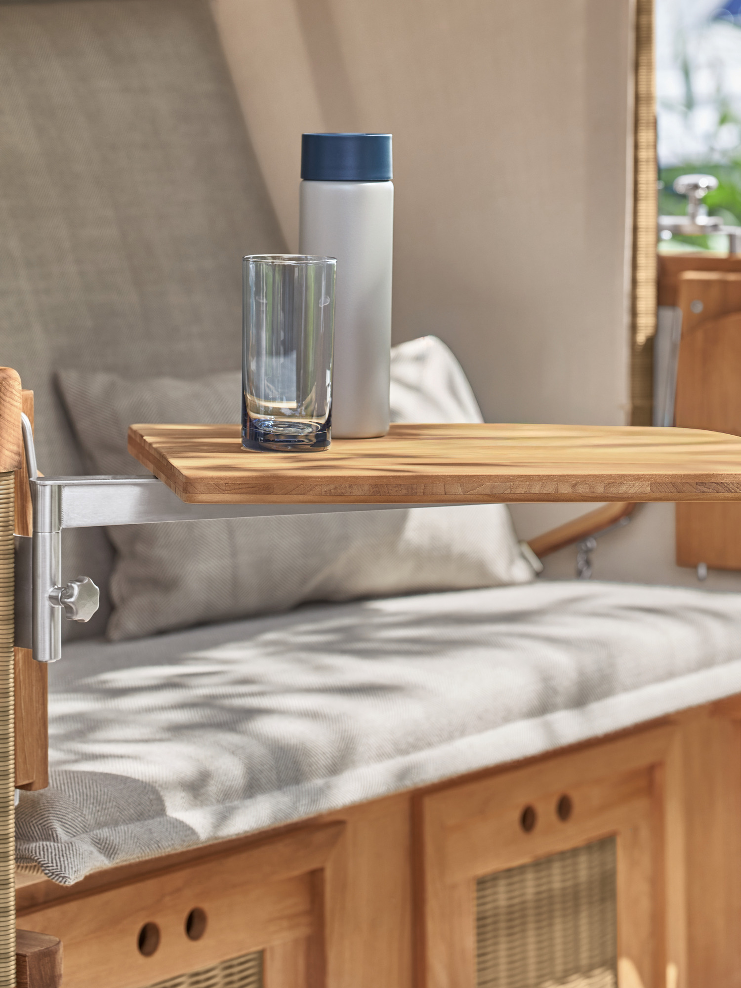Der schwenkbare Zusatztisch aus Teak wird in eine Edelstahlvorrichtung eingehängt.